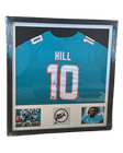 Es un cuadro enmarcado con una camiseta de fútbol americano de color turquesa. En el centro se muestra la parte trasera de la camiseta, con el nombre “HILL” en la parte superior y el número 10 grande en color blanco con borde naranja. Sobre uno de los números se aprecia una firma impresa, lo que le da un carácter conmemorativo.