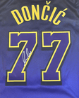 Es una camiseta NBA de Los Angeles Lakers, vista por la parte trasera, con un diseño en azul oscuro correspondiente a una edición alternativa. En la espalda aparece el nombre DONČIĆ y el número 77 en color dorado con borde oscuro, manteniendo la estética característica de los Lakers. El número incluye una firma estampada, lo que le da un carácter especial y coleccionable. En la parte superior se observa el logotipo oficial de la NBA, y en la zona inferior el detalle Dri-Fit, propio de las camisetas Nike, completando una prenda moderna y llamativa asociada a Luka Dončić.