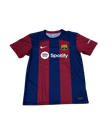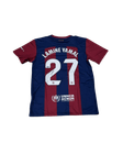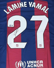 Una camiseta oficial del FC Barcelona, en su versión azul y granate con el número 27 y el nombre Lamine Yamal en la parte posterior. En la parte inferior aparece el logo del patrocinador UNHCR ACNUR (La Agencia de la ONU para los Refugiados). La camiseta incluye además una firma autógrafa sobre el número, lo que la convierte en una pieza especial y de colección para los aficionados del equipo y del joven talento Lamine Yamal.