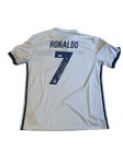El mítico jersey del Real Madrid 2017-2018, temporada donde Cristiano Ronaldo brilló con luz propia.Diseñado por Adidas y con el clásico patrocinio de Fly Emirates, este uniforme fue testigo de noches mágicas en Champions League, cuando CR7 guiaba al club blanco a su tercera orejona consecutiva.