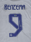 Es una camiseta de fútbol blanca, vista desde la parte trasera. En la parte superior lleva el nombre “BENZEMA” en letras grandes de color azul. Debajo aparece el número 9, también en azul con un contorno decorativo. En la zona inferior del número se aprecia el escudo del club, que parece ser el de un equipo de fútbol europeo muy conocido por sus colores blanco y azul.