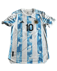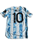 Es la camiseta oficial de la Selección de fútbol de Argentina con el nombre y número de Lionel Messi; presenta el clásico diseño albiceleste con franjas verticales blancas y celestes que incorporan un patrón moderno tipo camuflaje en tonos azules, en la espalda se lee “MESSI” en letras negras sobre el número 10 grande también en negro, incluye el sol dorado bajo el cuello representando el Sol de Mayo y un parche oficial en la manga, y está confeccionada en tela técnica ligera con corte deportivo, combinando la tradición argentina con un estilo contemporáneo asociado al histórico dorsal 10 de Messi.