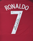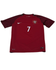 Se trata de una jersey de la Selección de Portugal, en su característico color rojo vino, con detalles en un tono ligeramente más oscuro en las mangas y un borde verde en el cuello. En la parte posterior aparece el nombre “RONALDO” en la parte superior, junto al icónico número 7, muy asociado al jugador cuando representa a su selección.