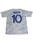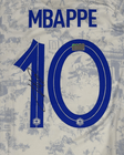 En la zona superior aparece el nombre “MBAPPE” en letras mayúsculas de color azul. Debajo, en el centro de la espalda, se encuentra el número 10, también en azul intenso y con un diseño moderno. Sobre el número se puede ver una firma, lo que sugiere que la camiseta podría ser una edición especial o autografiada.Los bordes inferiores muestran pequeños detalles en rojo, parte típica de los colores de la selección francesa.