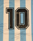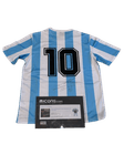 Jersey clásica de la Selección de Argentina, con el tradicional diseño a franjas verticales en celeste y blanco. En la parte trasera destaca el emblemático número 10 en color negro, símbolo del máximo ídolo del fútbol argentino. La prenda cuenta con autógrafo en la parte inferior y se acompaña de su certificado de autenticidad de ICONS, lo que la convierte en una pieza de alto valor para coleccionistas. Un artículo icónico que representa historia, pasión y grandeza del fútbol mundial.