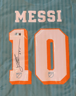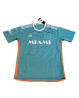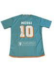 Es una jersey del Inter Miami CF en color verde azulado con un diseño de líneas verticales sutiles que le dan un estilo moderno y elegante. En la parte trasera se aprecia el nombre MESSI junto al icónico número 10 en color blanco con borde naranja, destacando una firma impresa que aporta un carácter especial y coleccionable. En la parte inferior se incluye el patrocinador Royal Caribbean International en blanco, mientras que los detalles en naranja en el cuello y el dobladillo completan un diseño llamativo que combina identidad deportiva y estética contemporánea.