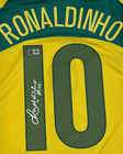 Es una jersey de la selección de Brasil de color amarillo vibrante con detalles en verde en los hombros, el cuello y las líneas laterales, con un diseño clásico y muy representativo de la era dorada del fútbol brasileño. En la parte trasera aparece el nombre Ronaldinho junto al icónico número 10 en verde oscuro, el cual incluye una firma impresa del jugador que le añade un valor especial y un carácter coleccionable. Es una camiseta de manga corta y corte deportivo tradicional, asociada a los primeros años de los 2000, y simboliza el talento, la alegría y el estilo que Ronaldinho llevó a la selección brasileña.