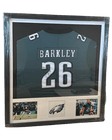 Es un cuadro enmarcado con una camiseta de fútbol americano de color verde oscuro. En la parte central se ve la espalda de la camiseta, con el nombre “BARKLEY” en la parte superior y el número 26 grande en color claro, que además parece tener una firma sobre uno de los números.