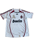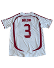 Camiseta de fútbol del AC Milan, en color blanco con elegantes detalles en rojo que recorren los laterales y los hombros, dándole un estilo clásico y sobrio. En la parte trasera se aprecia el nombre “Maldini” y el número 3 en rojo, un dorsal histórico y emblemático del club.