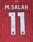 Jersey oficial del Liverpool FC en su característico color rojo, correspondiente a Mohamed Salah con el número 11. Presenta un diseño moderno con líneas geométricas sutiles en tonos más claros, nombre M. SALAH en la espalda y numeración blanca con detalles de la Premier League. Incluye una firma estampada, lo que la convierte en una pieza especial para coleccionistas y fanáticos. Confeccionada en material ligero y transpirable, ideal para apoyar a los Reds con estilo y pasión.